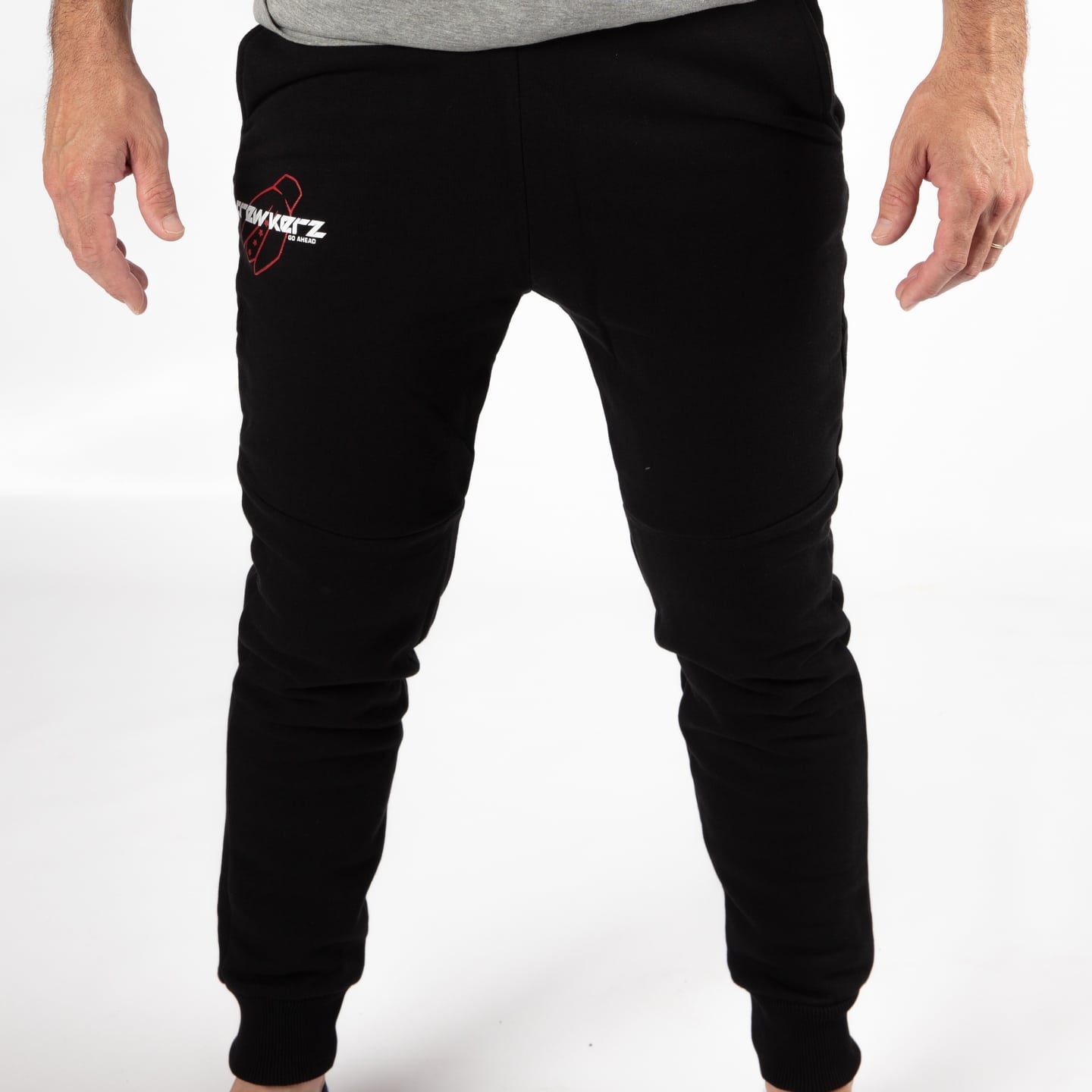Bas de jogging CREWKERZ Noir avec logo rouge et blanc. Modèle adulte mixte. Coupe ajustée resserrée en bas, poche nippée à l'arrière.